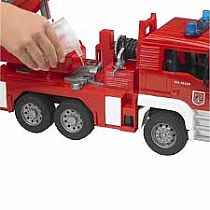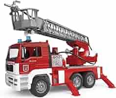 If you know a child without a fire truck of this caliber, come to the rescue. Made of tough, high-quality plastic, the MAN Fire Engine has the usual lights and siren, and a whole lot more: a roll-up hose that shoots real water, a cab that opens, a detailed engine, an extendable basket ladder and stabilizer legs. Made in Germany, its 18½" of exceptionally high quality and realistic detail!