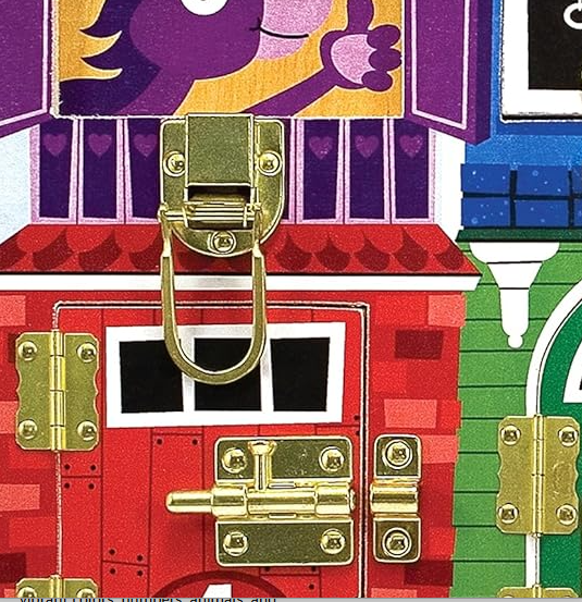 Unlatch and unlock and discover this colorful house is really a zoo! A super fine-motor skill builder, Latches Board challenges children to open six windows and doors that are fastened with six different and very real latches and locks. Kids will have fun recognizing and counting the animals under each. For ages 3-5 years.