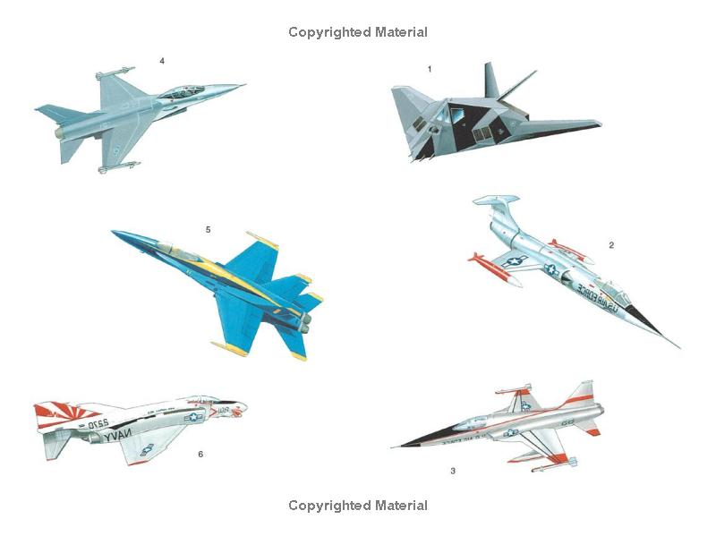 Aspiring pilots will love these bold, realistic tattoos of authentic jet fighter planes. Six sleek models include the Lockheed F-104G, flown by U.S. Air Force pilots, and the F/A-18 Hornet, made famous by the U.S. Navy's Blue Angels, plus the F-4 Phantom, Northrop F-5E, F-117A Stealth Fighter, and F-16.