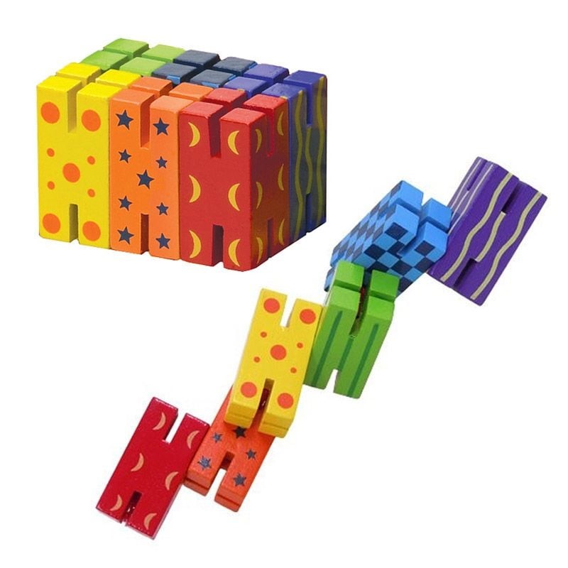 A wooden multi color little do nothing that will keep'em busy for hours. Strung together with elastic for creating multiple shapes. Age: 3 to 100 years. Warning: Small PARTS NOT FOR UNDER 36 MONTHS.