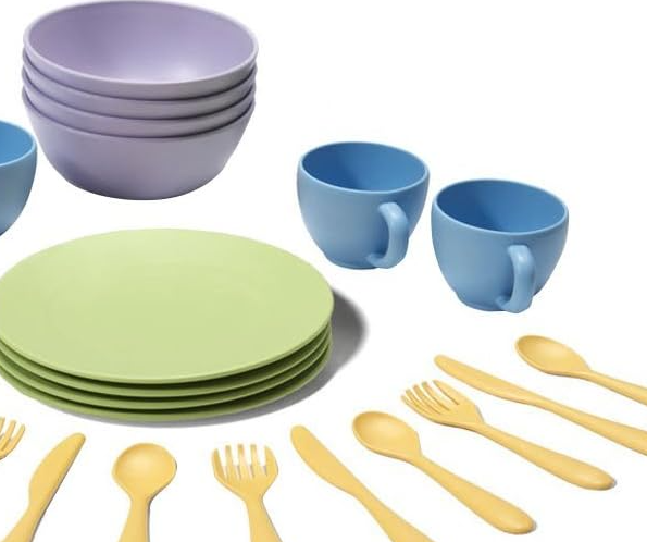 Eco-friendly starts right here. Green Toys are made from 100 curbside collection recycled plastic. Every family plays their part in the recycled circle. Dish set contains 4 plates, 4 cups, utensils and 4 bowls. Made entirely in the United States, and made for fun.