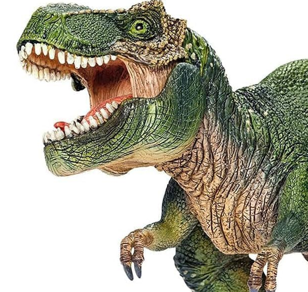 Although the Tyrannosaurus Rex looked quite threatening, it could hardly use its front legs armed with just two claws since they did not even reach his mouth. Nearly seven metres tall and thirteen metres long, the Tyrannosaurus Rex was probably not a very skilled hunter, but rather a scavenger which probably fed on the leavings of other animals. It had more than fifty teeth measuring more than 15 centimetres in length which it used not for chewing but rather for tearing, since it swallowed its food in large chunks. To improve depth-perception when searching for food, the eyes of the Tyrannosaurus Rex were oriented toward the front such that the fields of vision of both eyes overlapped.