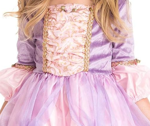 This gown is made from a sparkly crushed velvet bodice and amazing gold trims. The unique princess sleeve is absolutely elegant, and the billowy-organza overskirt makes this dress perfectly princess. Features: Clothing quality fabrics; machine washable. Comfortable; no itchy fabrics or trims