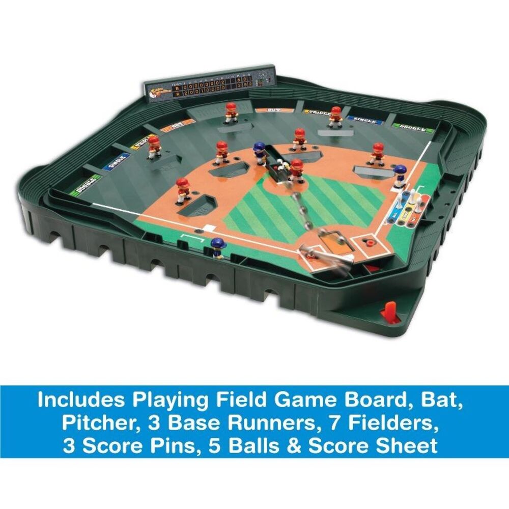 Launching levers and hidden contraptions make this miniature baseball game a real crowd-pleaser! Step up to the plate and swing for the fences! Realistic baseball action allows you to hit singles, doubles, triples, and homers with the spring-loaded bat. If you want to play baseball everyday even when it’s raining or night time, the Super Stadium Baseball Game is perfect for you. You get everything you love about baseball without leaving the table. Hot dogs and sodas not included. Magnetized infield creates ball movement. Dual Pitching lever controls curve balls and changes speed. Your opponent won't be able to predict the type of ball. You can throw a fastball, slider, sinker, change up, or whatever your preferred pitch is. The Super Stadium Baseball Game has everything of a real baseball game including Dual breaking ball lever, switch hitter feature, disappearing miracle ball, score pad, adjustable fielders positions, batter counts and the ability to choose pitches thrown. Package contains (1) Game Zone Super Stadium Baseball Game with Realistic Baseball Action. Includes (1) playing field, (1) bat, (1) pitcher, (3) base runners, (7) fielders, (3) score pins, (5) balls, score sheet, and instruction manual. 1 - 2 players, Ages 6 and up.