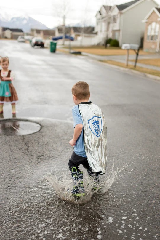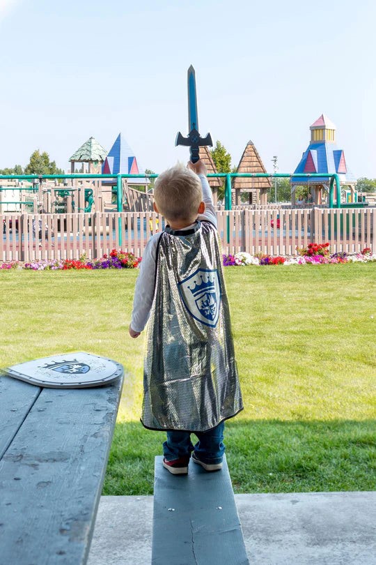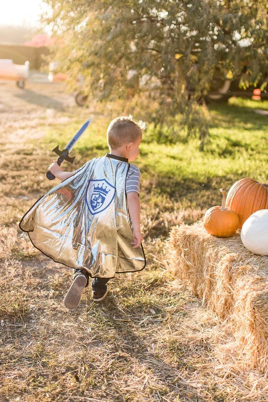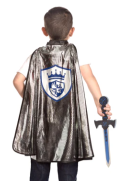 Make your child’s wildest dreams come true with this newly designed Knight Cape & Sword Set. The knit cape with shiny foil chain mail print and knight emblem is easy for children to put on and take off with quality velcro closures. Finish the look off with the matching brightly colored and edgy foam sword. Features: washable knit cape. Quality velcro closure easy for kids. Sizes: One size