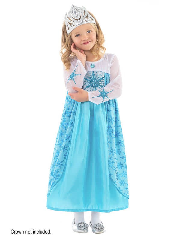 Let your little one fulfill her dream of becoming the Ice Princess. The frosty swirl pattern on this skirt will have your princess swirling ice sculptures in minutes. The decorative lining along the neckline is polished with a single gem. Enjoy the unique sheer drape that delicately falls behind her to create a royal effect. The sleeves and sparkly bodice are made of a stretch-knit fabric and are embellished with a custom glitter print. The dress is finished with a silver sequin detail along the hem. To complete this winter story see our Scandinavian Princess. Features: : clothing quality fabrics; machine washable. Stretchy, soft and very comfortable