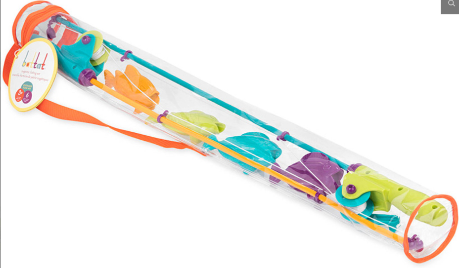 This deluxe set includes a 15 inch long fishing rod with retractable fishing line and magnetic lure. Reel makes a ratcheting sound. Comes with five colorful floating fish and hand net.