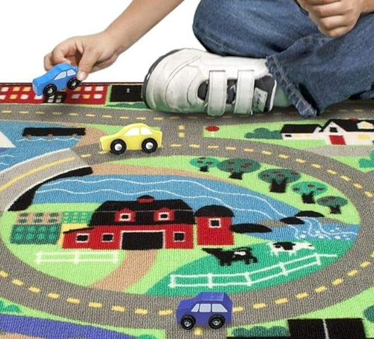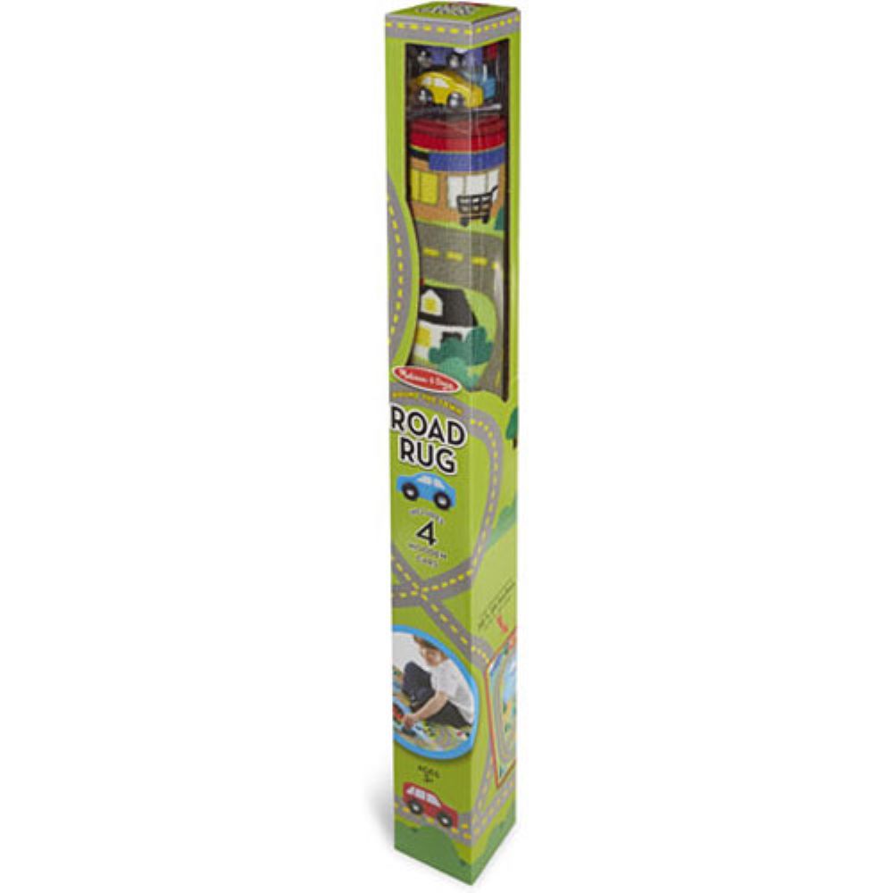 For little imaginations, there’s a whole world contained in this durable 39?x36? colorful rug, ready to provide the backdrop for hours of “Where shall we go?” fun. At its center, there’s a farm, surrounded by a school, parking lot (with numbered spaces), grocery store and lake. Four beautiful little wooden cars travel on the connecting roadways. A classic favorite with limitless learning potential. From Melissa & Doug, for ages 3-6 yrs.