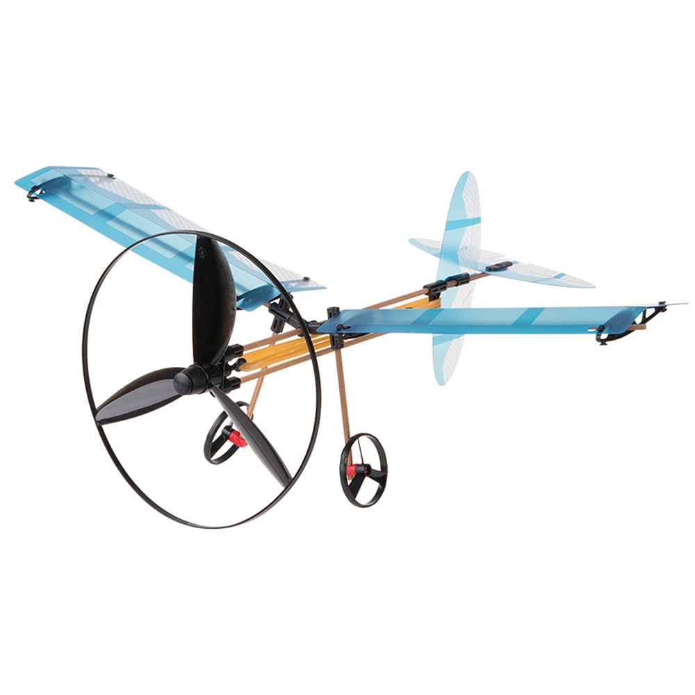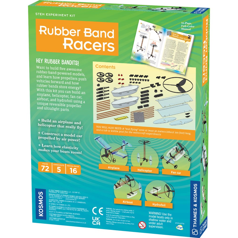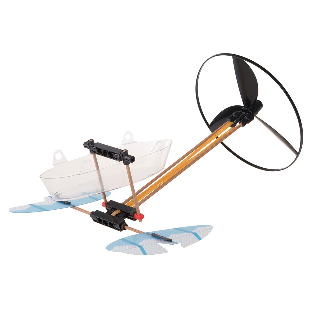 Fly into physics fun with five models driven by an awesome rubber band powered propeller. Using ultralight plastic and bamboo parts, build a helicopter, fan boat, airplane, car, and catamaran. Learn how the elastic material stores energy and then releases it to move the models.