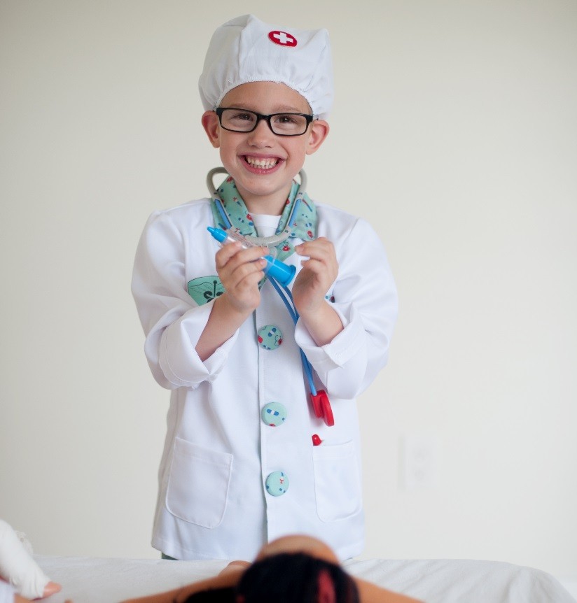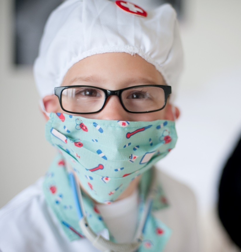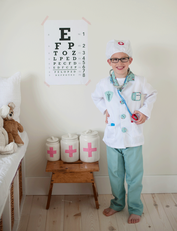Set includes white Lab coat, green scrubs (pants and top), mask, stethoscope, syringe and thermometer all in a garment bag.