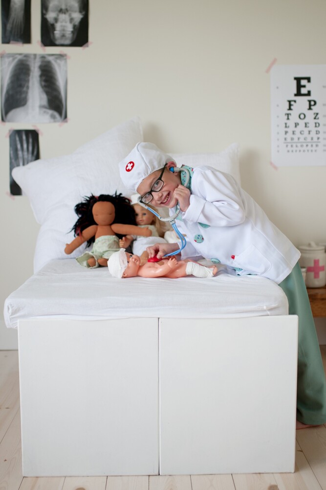 Set includes white Lab coat, green scrubs (pants and top), mask, stethoscope, syringe and thermometer all in a garment bag.