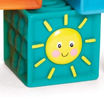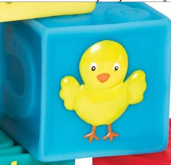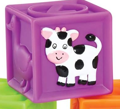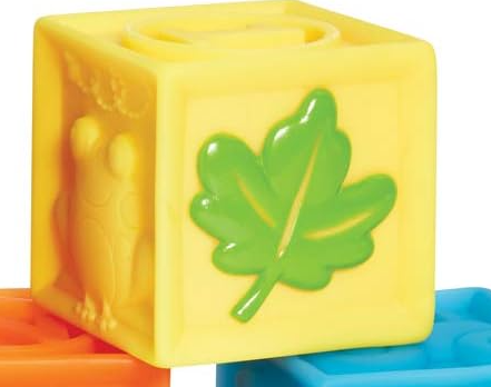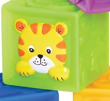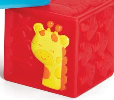 The good things about these 9 soft blocks just seem to stack up. No hard edges. Beautiful graphics. Bold colors. Safe for little teethers. And a zippered carry case. It all adds up to squeaky fun!