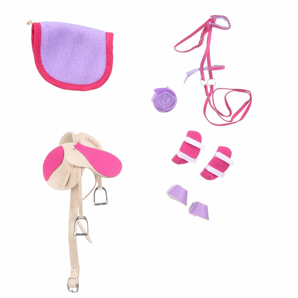 Breyer Traditional Series - English Riding Set - Fun colors make this set stand out! Saddle, bridle, saddle pad, polo wraps, bell boots and splint boots come in the beautiful combination of pink and purple. (Blister Card Packaging) Horse Not Included.