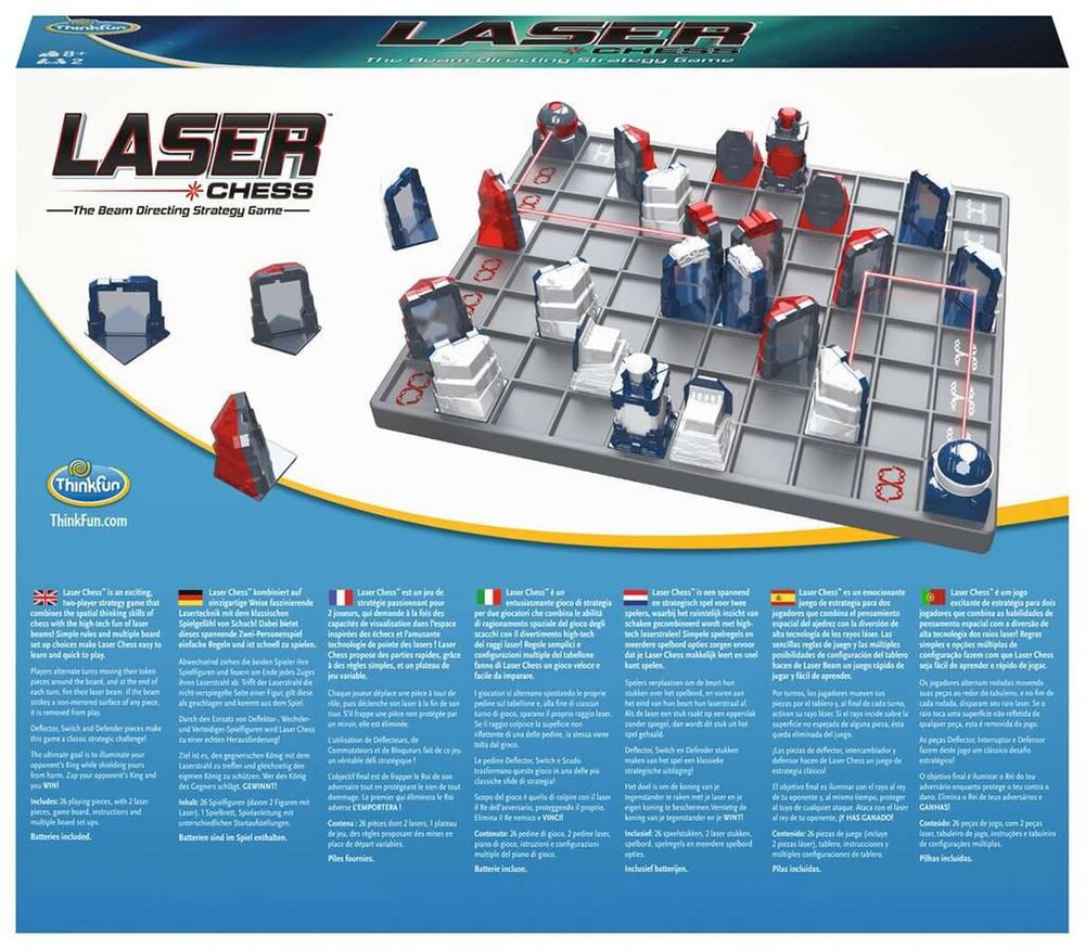 Parent Tested Parent Approved Top Pick of Toy Fair 2018 Laser Chess is a two-player strategy game that combines the spatial thinking skills of chess with the high-tech fun of laser beams. Players alternate turns moving their mirrored pieces around the board, and at the end of each turn, players fire a real laser beam from their Laser. The laser beam bounces from mirror to mirror, and if the beam strikes a non-mirrored surface of any piece, it is immediately removed from play. If you illuminate your opponent's King - YOU WIN!