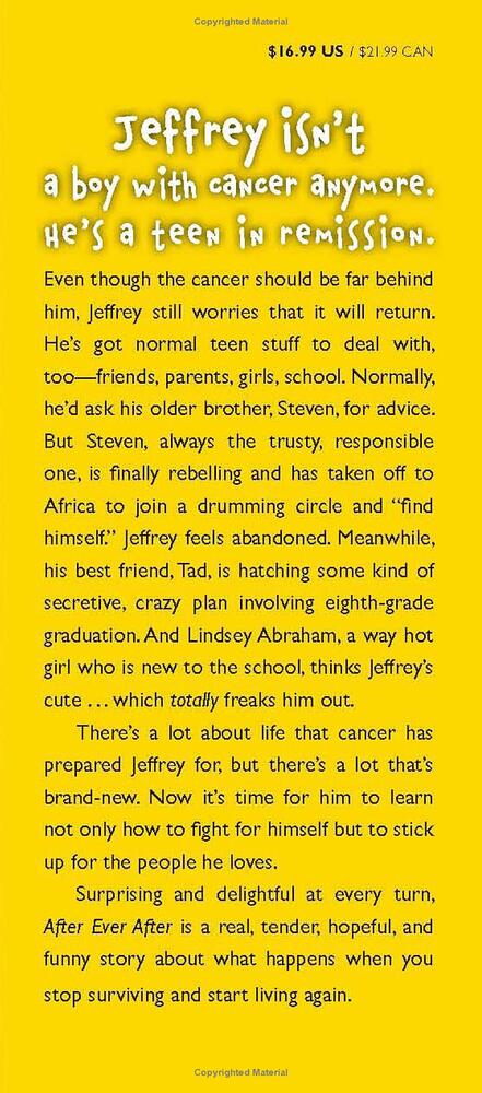 Jeffrey isn't a little boy with cancer anymore. He's a teen who's in remission, but life still feels fragile. The aftereffects of treatment have left Jeffrey with an inability to be a great student or to walk without limping. His parents still worry about him. His older brother, Steven, lost it and took off to Africa to be in a drumming circle and "find himself." Jeffrey has a little soul searching to do, too, which begins with his escalating anger at Steven, an old friend who is keeping something secret, and a girl who is way out of his league but who thinks he's cute.