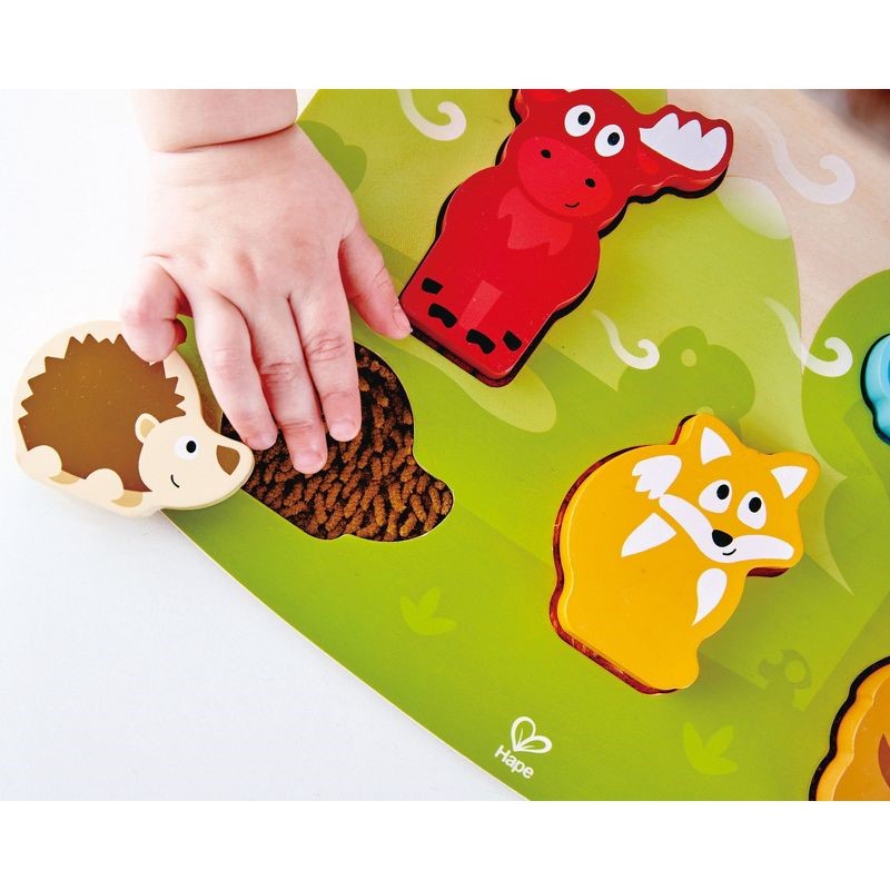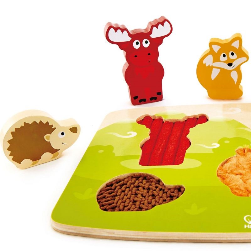 Want to cuddle a moose? Forest animals need special coats to keep them warm and dry. Remove the pieces of this puzzle to feel the different textures of the coats of the moose, owl, hedgehog, fox and bear! A forest play surface shows children the different habitats each animal lives in: treetops, mountains, and forest floor. Great for developing motor skills!
