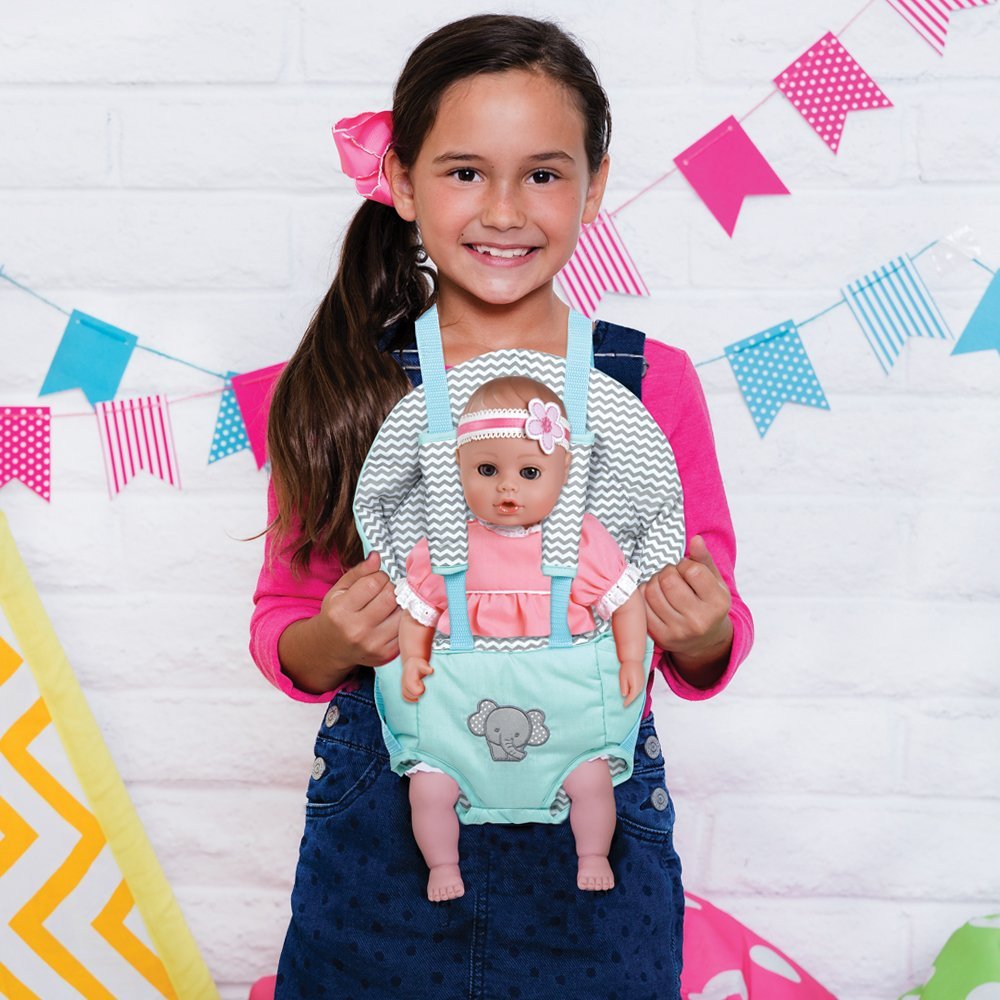 Adora’s Zig Zag Baby Doll Carrier is perfect for “little parents” on the go! Can easily fit most 13 – 20in. baby dolls and features an attractive gender-neutral zig zag design in teal, white and gray. Made with comfortable, high quality materials, your little one can tote their dolls in the front or back with this dual-purpose carrier. It features two adjustable vertical straps and a drawstring in the back to accommodate various sized dolls for endless adventures.