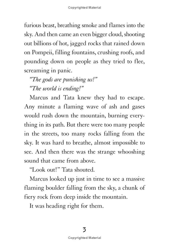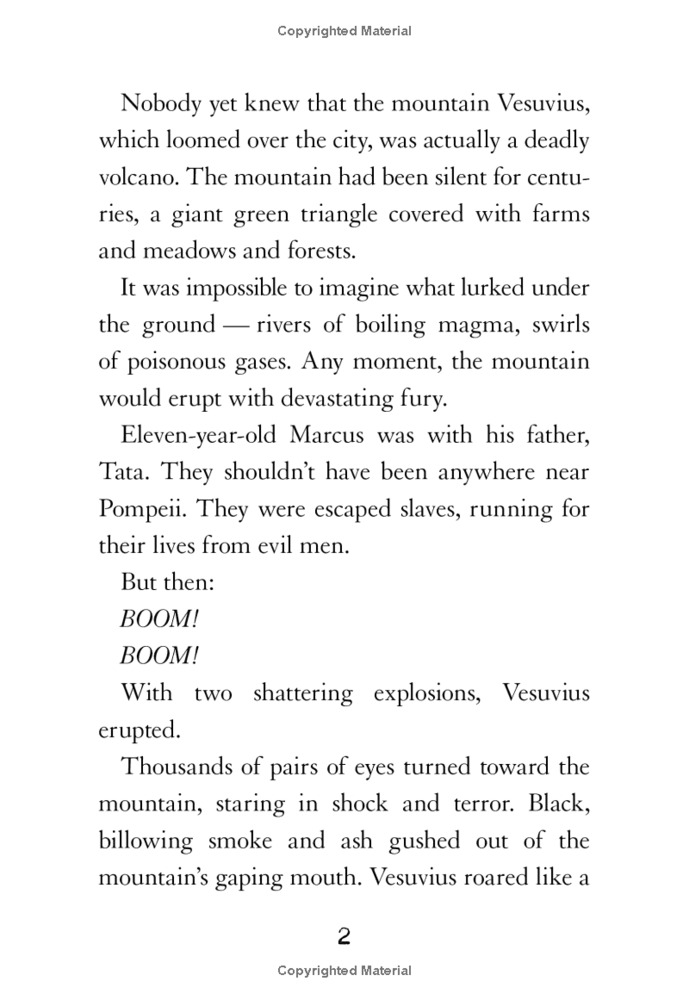 No one in the bustling city of Pompeii worries when the ground trembles beneath their feet. The beast under the mountain Vesuvius, high above the city, wakes up angry sometimes -- and always goes back to sleep.But Marcus is afraid. He knows something is terribly wrong -- and his father, who trusts science more than mythical beasts, agrees. When Vesuvius explodes into a cloud of fiery ash and rocks fall from the sky like rain, will they have time to escape -- and survive the epic destruction of Pompeii?