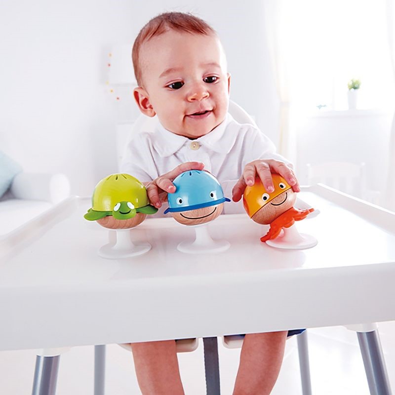 Babies will be enchanted by the Stay-put Rattle Set's differing sounds, bright colors and aquatic animals. Moreover, with their handy suction cups, playtime is possible anywhere, anytime! Attach one of the Stay-put Rattle Set's toys to a smooth surface using the rattles' suction pad and enjoy musical play and experimentation wherever you are. The Stay-put Rattle Set includes three cute and colorful rattles, including a whale, a turtle and an octopus, that all emit a different sound when shaken. Introduces young babies to the wonders and magic of sound and to the world of aquatic animals. Perfect toy for travel and on-the-go play. Suitable for newborns and up.