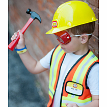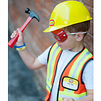 Build your heart out! This construction set has you prepped and ready for the job and looking the part in this complete 7 piece dress-up-and-play set. This set includes an orange vest with reflective stripes, a hard hat with decal, play plastic a hammer, a play plastic mini saw, a play plastic screwdriver safety goggles, and a name tag so everyone at the job site knows who you are. All our Great Pretenders Career Costumes are packaged in a reusable blue garment bag for easy storage. 7 Piece Set: reflective orange vest, tool belt, hat, hammer, screwdriver, name tag and saw.
