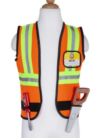 Get ready to build! Dressed for the work site, including reflective vest, tool belt, hat, hammer, screwdriver, name tag and saw, the work will never be too tough! For size 5-7, and machine washable.