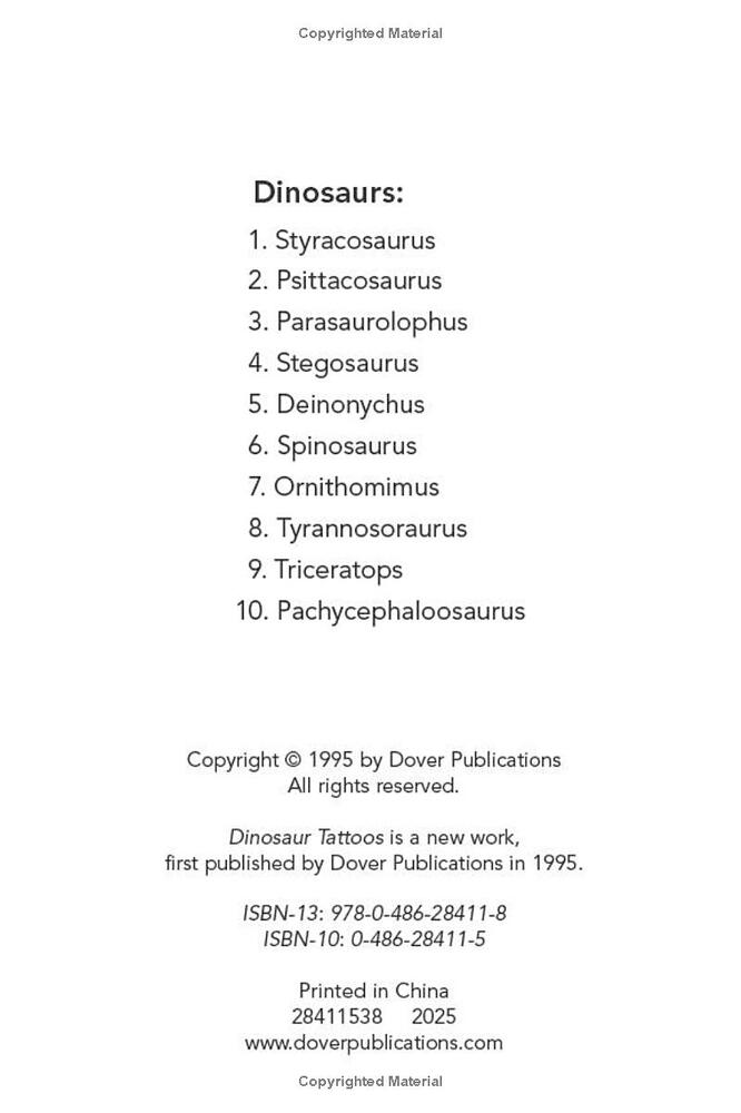 Ten realistic renderings of popular dinosaurs include images of the three-horned triceratops, the stegosaurus and its bony plates, the spiky styracosaurus, and the fearsome king of them all, tyrannosaurus. Designed to stay bright and colorful for days, these tattoos can be easily removed with alcohol or baby oil.