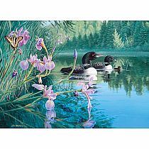 A hidden little cove with beautiful purple flowers and red eyed loons are the reason this pond is known as Iris Cove Loons. Take an adventure with Cobble Hill's 500 piece random cut puzzle made with textured linen print paper to reduce glare and a reference poster to help assemble the puzzle.