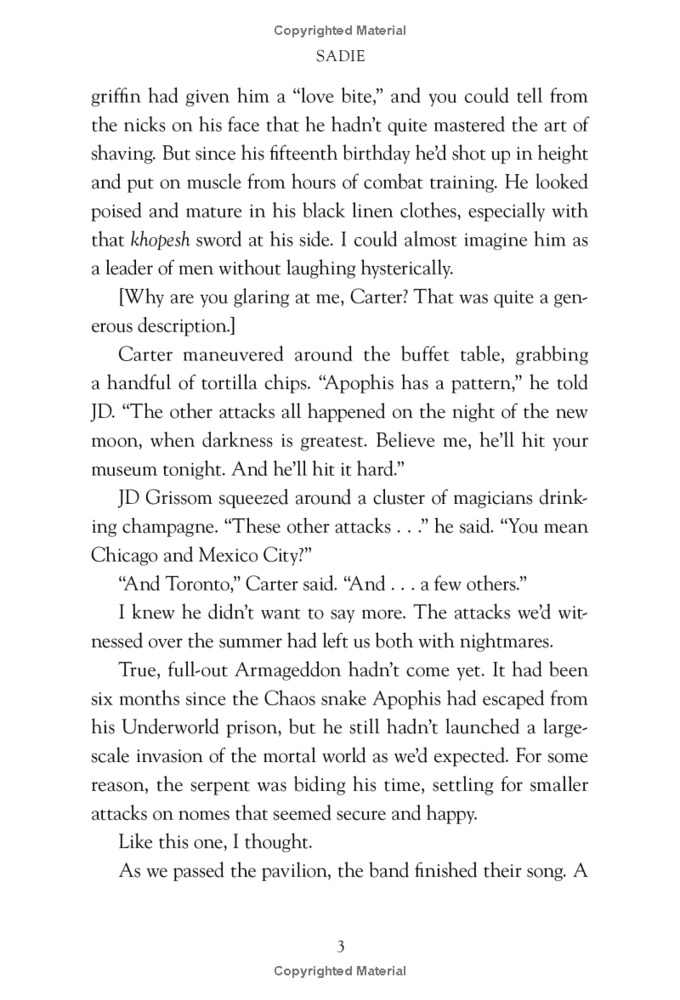 There is possibly one way to stop Apophis, but it is so difficult that it might cost Carter and Sadie their lives, if it even works at all. It involves trusting the ghost of a psychopathic magician not to betray them, or worse, kill them. They'd have to be crazy to try it. Well, call them crazy.
