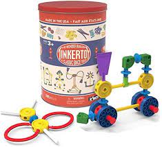 Introduce your little builder to a classic from your childhood with this TINKERTOY tin! Includes over 100 of your favorite TINKERTOY parts, including rods, spools, flags and washers, all made in the USA. The set comes with 15 different building ideas to get started-after that, the possibilities are endless! The nostalgic collector's tin offers easy, stylish storage. For ages 3+.