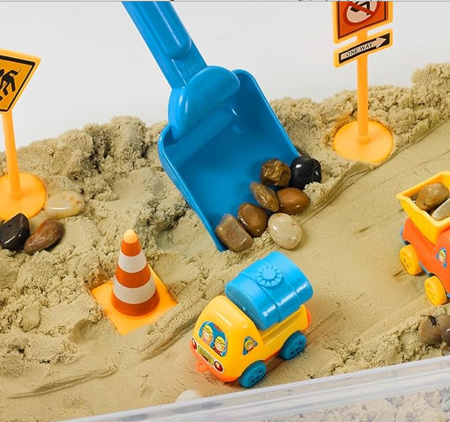 Go on a building adventure while engaging your sense of touch with a construction zone themed sensory bin! Play with sensory sand, rocks and trucks to build fine motor skills and promote sensory development