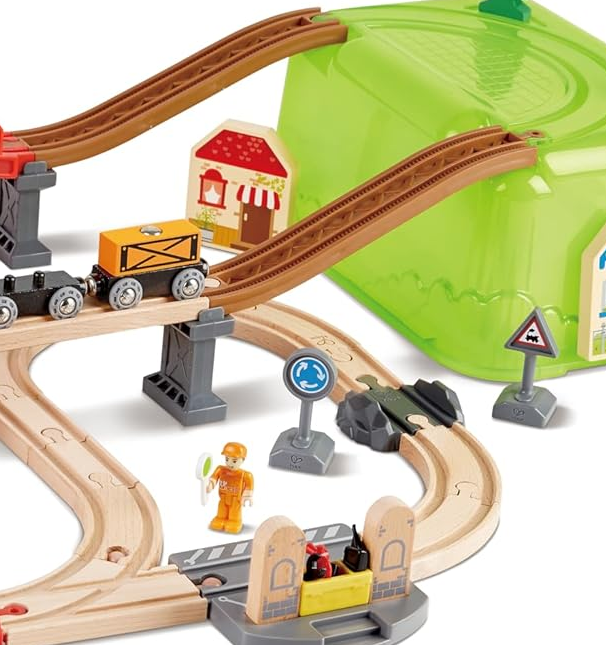 This great train set lets you build your own town! Unpack everything from the storage box then use the lid to create a cool little town for your passengers and cargo to move through!
