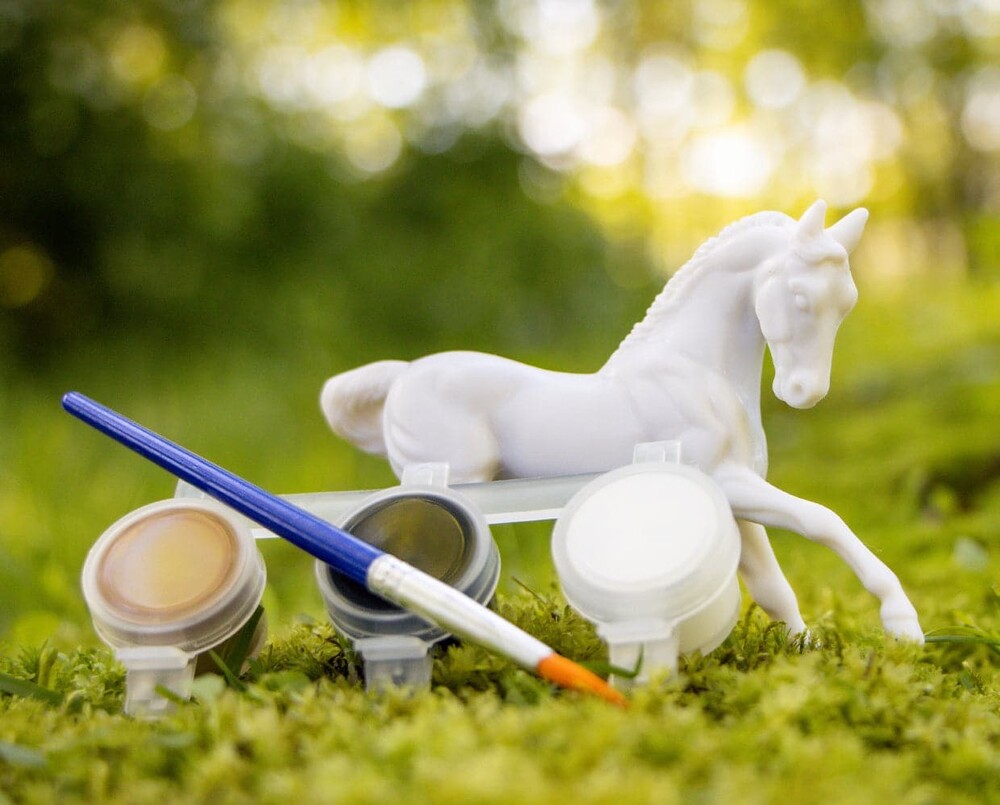 Contains: 1 unpainted Stablemate model horse, 3 paint pots with realistic horse colors and 1 brush.