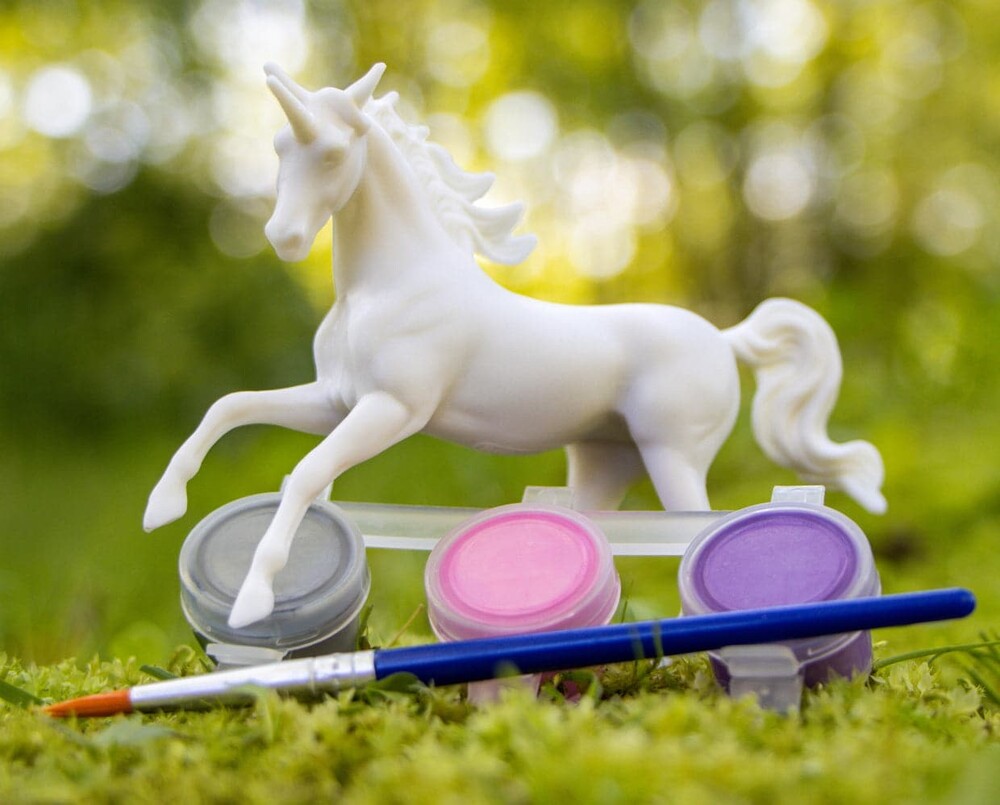 Contains: 1 unpainted Stablemate model unicorn, 3 paint pots with realistic unicorn colors and 1 brush.