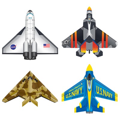This 12 piece SkyMax assortment from X-Kites features detailed, realistic designs. These single line kites are great for the novice to intermediate kite enthusiast. Assorted styles include Attack Copter, Fighter Jet, Space Shuttle and Stealth.