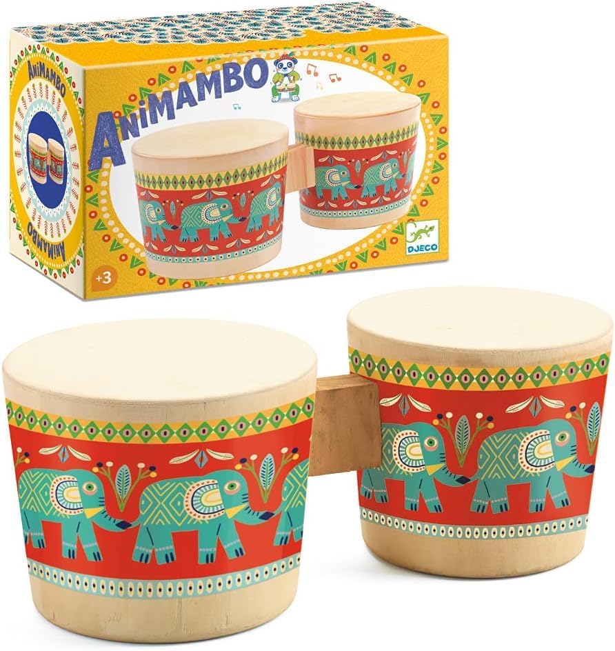 This wooden bongo is painted in bright, vibrant colours with elephants parading around the wooden base. This toy musical instrument co-ordinates with other instruments in the range. With a solid wood base, it measures L: 24 x W: 20 x H: 8.5 cm. With a bit of practice, the bongo gives little children a sense of rhythm