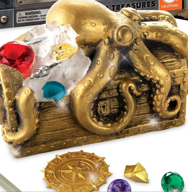 • Includes a treasure-filled pirate project measuring approx. 7” long, a mini treasure dig, 13 total treasures, 2 chiseling tools, 1 hammer, 1 excavation brush, 1 sponge, an infographic treasure map poster and a guidebook/excavation journal