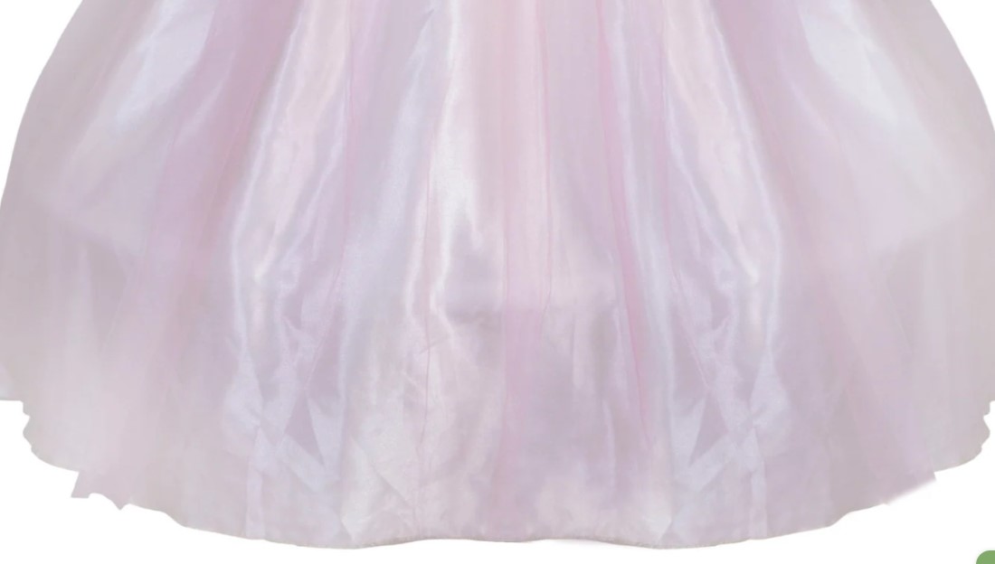 This absolutely stunning and elegant dress is designed with great attention to the finest details. The soft and silky skirt has a hoop and a shimmery top layer with a sparkly peplum. The crushed velvet bodice has a satin inset embellished with gold embroidery and finished with fancy golden trims. Elasticized waistband is adorned with pink and champagne-colored roses at the front. This gown is dreamy and it’s dream come true for all little princesses!