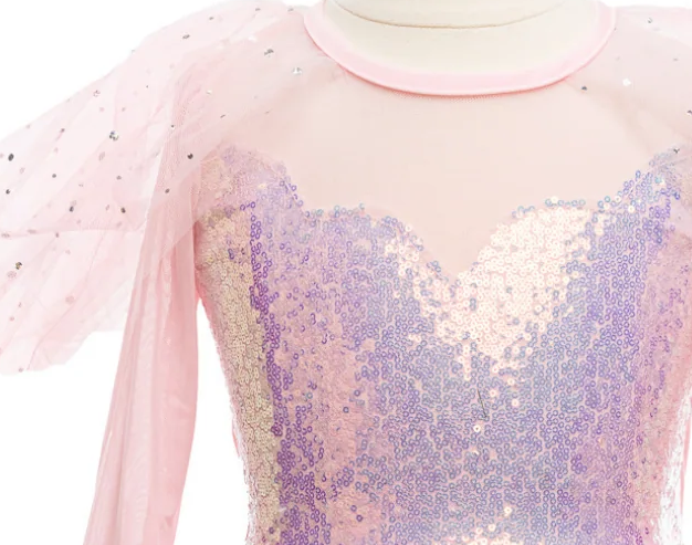 Elegant in Pink Princess Dress is a stunning design with a gorgeous sequinned bodice and illusion neckline (sweetheart neckline which is finished up to the neck with sheer and stretchy knit fabric) and satin trim. Attached to the neckline is a lovely sparkly capelet with scalloped finish, it’s made with pink mesh fabric showcasing printed holographic sequins. Elegant long sleeves are finished to a point. The skirt has a nice rich gathering of pink tulle finished with a ruffle made with the same holographic print as the capelet. The back of this dress has a Velcro closure and the elasticized waistband with a smocked waist (extra fabric gathering) provides even more comfort and size flexibility. Machine washable! This glamorous dress is sure to become your little one’s favourite childhood play costume!