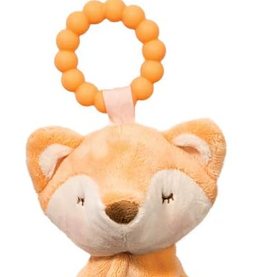 Bring the calm and quiet of a peaceful woodland day to your baby with our soothing Fox Teether toy. Our Shy Little Fox character is crafted with cuddly plush materials in an appealing orangey hue. This soft toy features a textured teether ring made of safe, 100% silicone to bring relief to Baby's teething pains. Friendly and comforting, our Fox's relaxed expression has been detailed in baby-safe embroidery along with a charming mushroom accent in the lower corner. Little ears, a fuzzy brown nose, and tiny knotted feet add to the charm of this irresistible stuffed toy. Enjoy this Fox Teether on its own or consider matching it with other soft accessories from our Shy Little Fox collection.