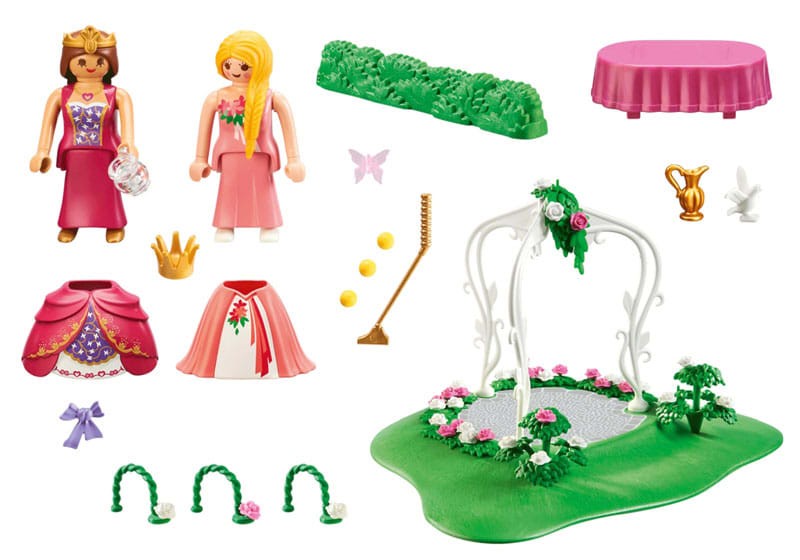 Figures: 2 princesses; Animals: 1 dove, 1 butterfly; Accessories: 1 pavilion, 2 hedges, 1 croquet mallet, 3 balls, 3 goals, 1 tiara, 1 glass, 2 skirts, 1 bow, 1 ball basket, 1 table, 1 jug