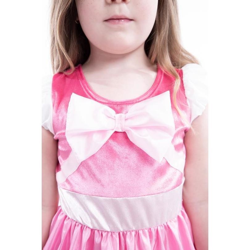 Accented with soft pink bows on the skirt and bodice