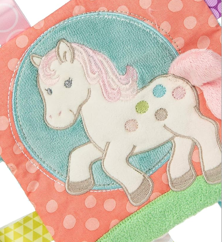 Part soother, part activity toy. Coordinates with the Painted Pony collection. Each Crinkle Me Taggies has fun character appliques and colorful patterns on the outside, crinkle paper and a squeaker on the inside. Flexible loop for attaching to stroller and crib. 8 Taggies ribbons. Machine wash, air dry.