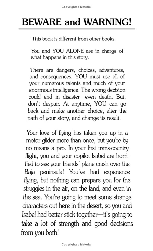 After a year of flight training, a surprise trip to the Baja Peninsula puts your skills to the test - but will they be enough to earn you your Silver Wings? Do you rush immediately to your friends' downed plane or wait till nightfall? Do you follow the shady character you spot snooping around the plane or stay hidden out of view? Who do you think tampered with your radio?