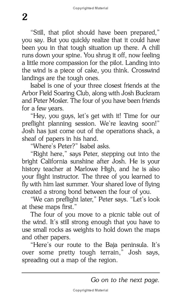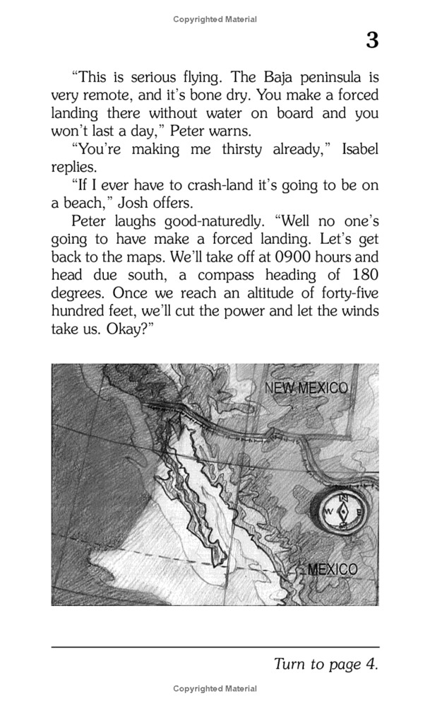 Silver Wings by R. A. Montgomery takes YOU on an adventure flying above - or crashing into! - the Baja Peninsula. 9-12 year old readers will learn to perform under pressure, piloting a motor glider through inclement conditions, caring for navigator Isabel after she falls mysteriously ill, escaping the threat of violent bandits, and helping friends Peter and Josh after an emergency landing.