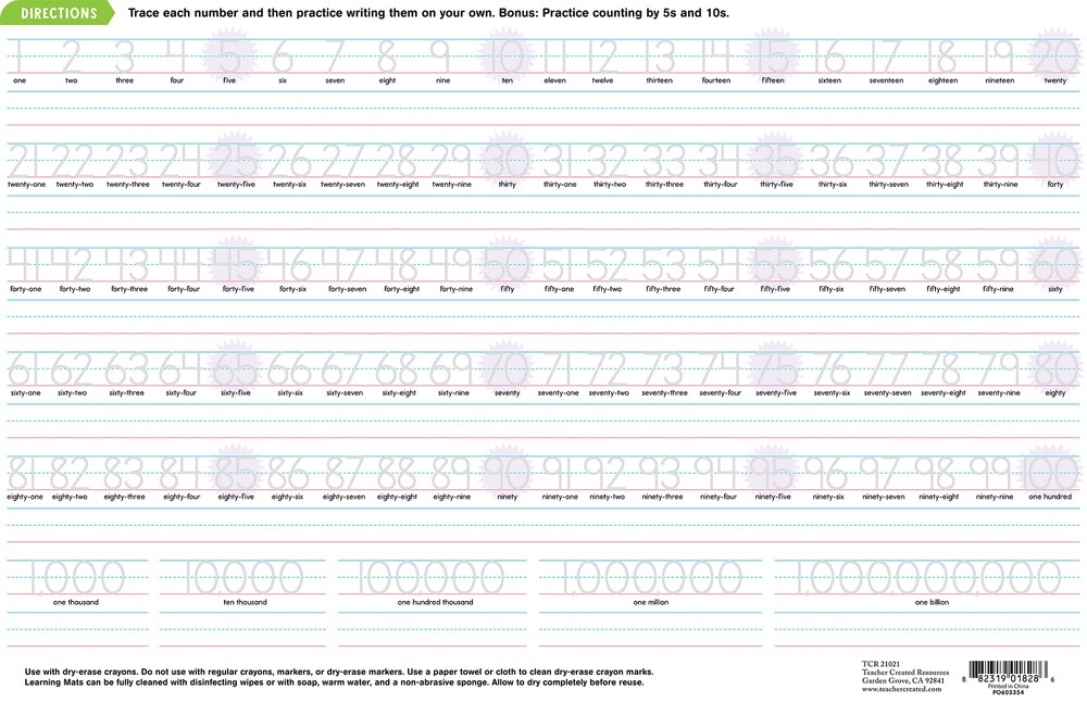 With this durable write-on/wipe-off learning mat, students can trace each number, and then practice writing them on their own! Great for at-home, for a fun meal-time activity, or take it on-the-go to use in the car or while eating out. Ages 5+.