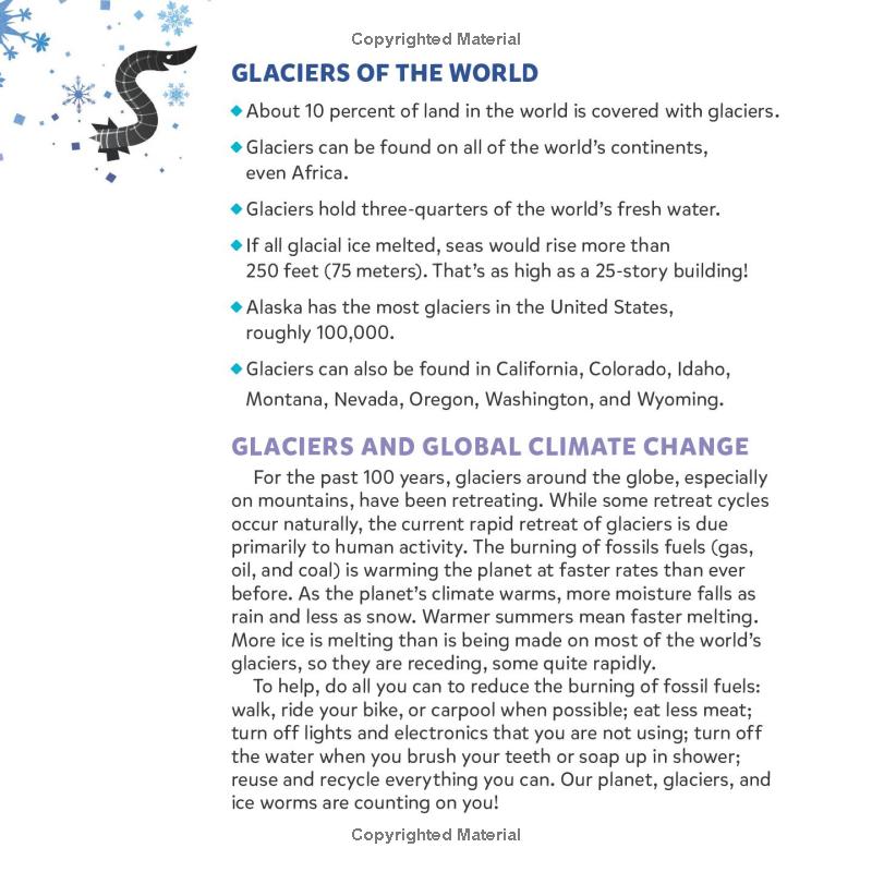 Glaciers exist on every continent on earth, growing, spreading, and shrinking over thousands of years. But what are they, and how are they formed? Glacier on the Move tells the story of a glacier named Flo and her slow-motion race to the sea, from the edge of an ice field and down steep cliffs, to muscling her way around mountains, and stretching into a valley. With the help of some iceworms in the margins, Flo reveals how glaciers move, change shape, and provide for the surrounding world and animals. Blending fascinating science facts with dynamic illustrations, Glacier on the Move introduces young readers to glacial history and science in a captivating and unique way.
