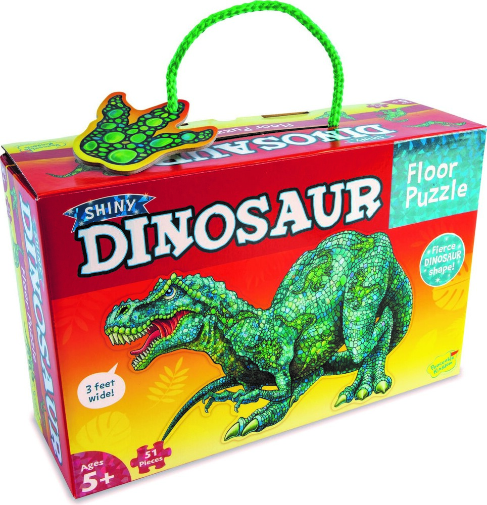 This adorably designed Dinosaur Floor Puzzle has shiny foil accents for extra fun. Piece together 51 thick and sturdy pieces, with unique shapes for curious minds, including a pterodactyl, a stegosaurus and more!• Develops visual recognition, fine-motor skills and problem-solving• Great for classrooms or at home • 51 piece puzzle measuring approximately 2' x 3' once assembled• Includes storage box with a corded handle for easy carrying