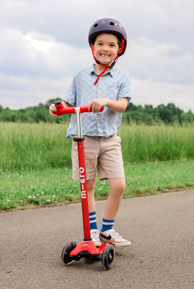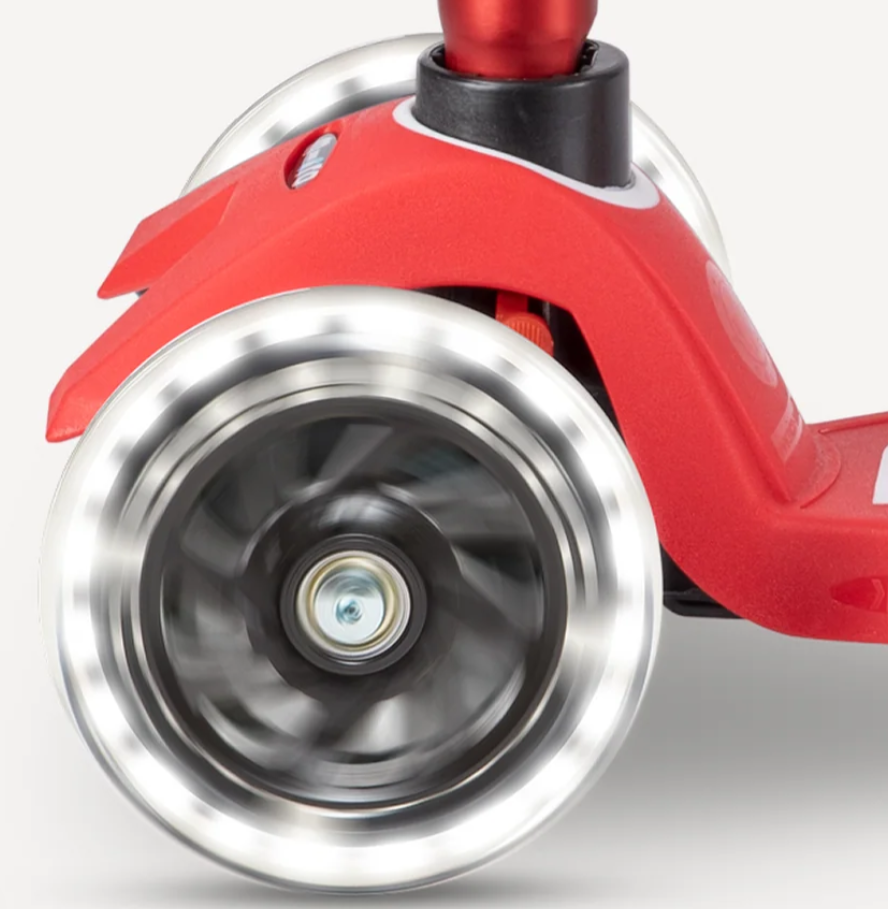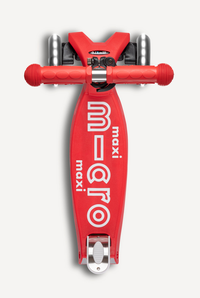 Micro's 3-wheeled Maxi Deluxe LED scooter features two front LED motion-activated light-up wheels. (No batteries required!)