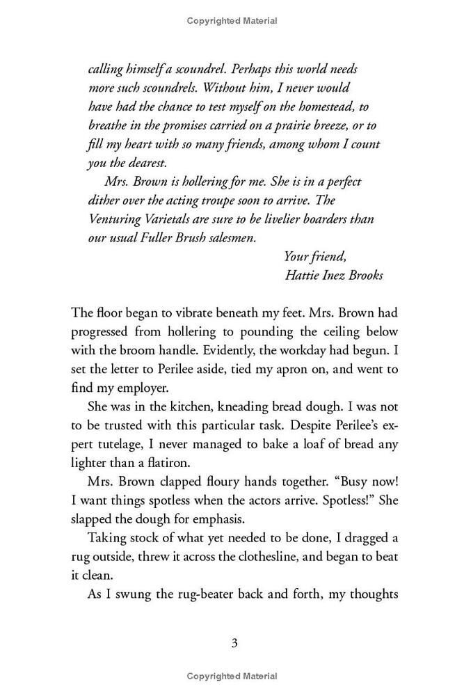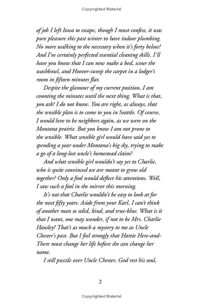 After leaving Uncle Chester's homestead claim, orphan Hattie Brooks throws a lasso around a new dream, even bigger than the Montana sky. She wants to be a reporter, knowing full well that a few pieces published in the Arlington News will not suffice. Real reporters must go to Grand Places, and do Grand Things, like Hattie's hero Nellie Bly. Another girl might be stymied by this, but Hattie has faced down a hungry wolf and stood up to a mob of angry men. Nothing can squash her desire to write for a big city newspaper. A letter and love token from Uncle Chester's old flame in San Francisco fuels that desire and Hattie jumps at the opportunity to get there by working as a seamstress for a traveling acting troupe. This could be her chance to solve the mystery of her "scoundrel" uncle and, in the process, help her learn more about herself. But Hattie must first tell Charlie that she will not join him in Seattle. Even though her heart approves of Charlie's plan for their marriage, her mind fears that saying yes to him would be saying no to herself. Hattie holds her own in the big city, literally pitching her way to a byline, and a career that could be even bigger than Nellie Bly's. But can making headlines compensate for the pain of betrayal and lost love? Hattie must dig deep to find her own true place in the world. Kirby Larson once again creates a lovingly written novel about the remarkable and resilient young orphan, Hattie Inez Brooks.