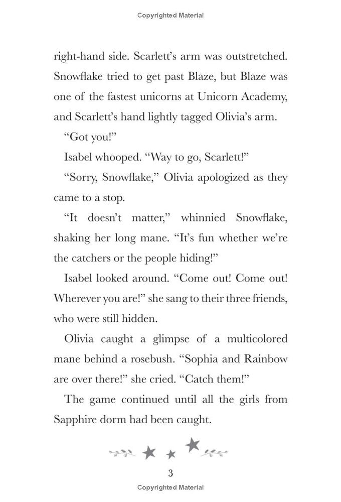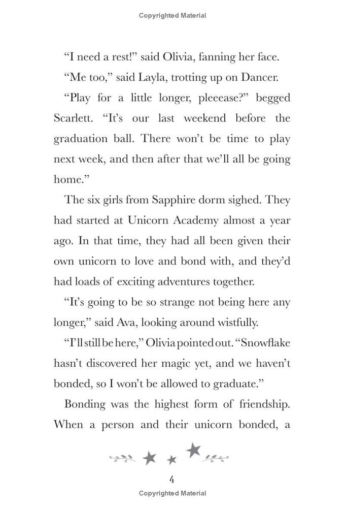 Olivia hopes her sweet unicorn, Snowflake, will discover her magic before graduation day! Everyone is busy decorating Unicorn Academy for the graduation ball, but it looks like someone is trying to ruin the party. Can Olivia and Snowflake save the day and the school?